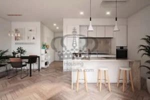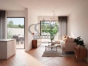 Las viviendas se distribuyen en dos cómodas plantas. En la planta baja, el hall de entrada con doble altura da paso a un dormitorio doble o despacho, un baño completo y una zona de lavadero independiente. El gran salón-comedor se integra con una cocina con isla que conecta directamente con el jardín, creando un espacio luminoso y abierto al exterior.